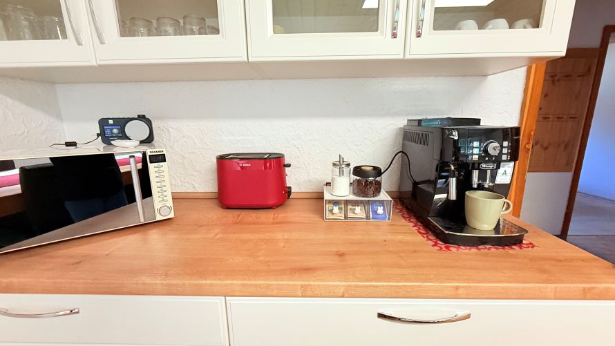 eine vollausgestattete Küche mit Induktionskochfeld, Backofen, Geschirrspüler, Wasserkocher, Kaffeevollautomat, Filterkaffeemaschine, Toaster, Eierkocher, Kindergeschirr, Küchenwaage, Handrührgerät, Pürierstab, Backset, Kuchenplatte, Mikrowelle, Raclette, ausreichendes Geschirr, Kühl-Gefrierkombination,