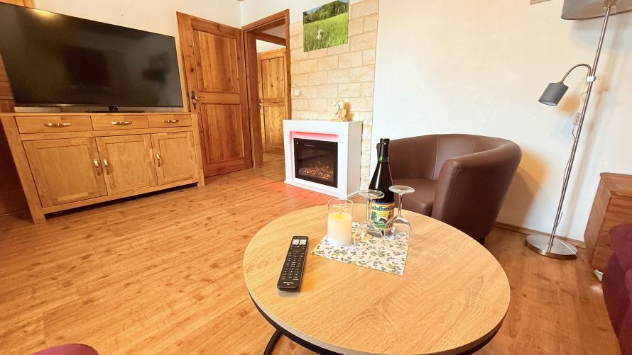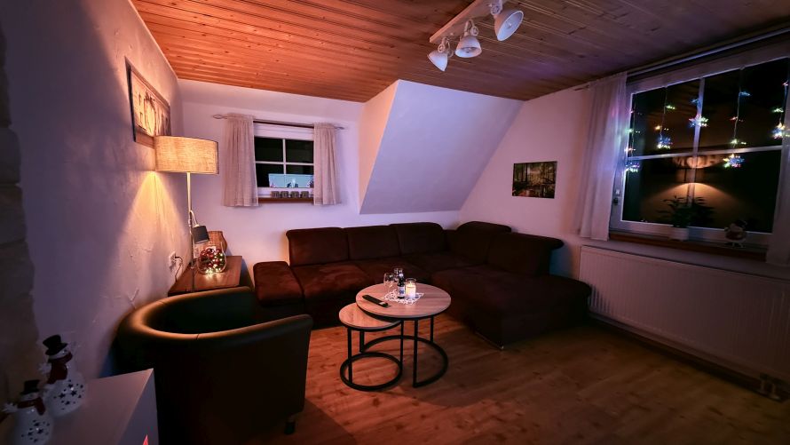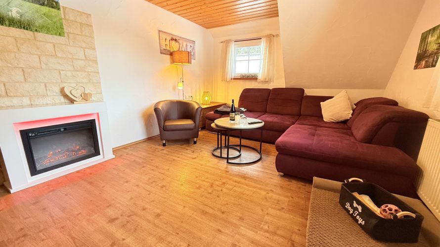 Das gemütliche Wohnzimmer mit Elektrokamin, großem hochwertigen Ecksofa lädt zum relaxen und entspannen ein. Ob Sie ein Buch lesen oder Sie sich es mit Ihrer Familie auf dem großen Sofa gemütlich machen und einen spannenden Film gemeinsam auf dem großen SMART-SAT-TV anschauen. Außerdem steht ein Schreibtisch für Homeoffice und zur Unterhaltung Gemeinschaftsspiele zur Verfügung. Bringen Sie gerne Ihren Zugangsdaten für NETFLIX oder AMAZON PRIME VIDEO mit.