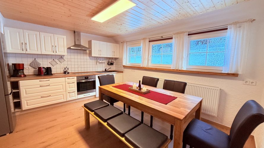 Die große Wohn-Essküche im modernen Schwarzwaldstil mit sehr guter Ausstattung lädt zum gemütlichen gemeinsamen kochen und essen, sowie auch für Spieleabende ein. Die Küche ist mit modernen Elektrogeräten für den täglichen Bedarf (Induktionskochfeld, Backofen, Geschirrspülmaschine, Mikrowelle Kaffeevollautomat, Kaffeemaschine, Wasserkocher, Toaster, Eierkocher, Raclette, Handmixer mit Pürierstab, Backset, Küchenwaage) und große Kühl-gefrierkombination für BARFER, ausreichendes Geschirr und Kochgeschirr ausgestattet.