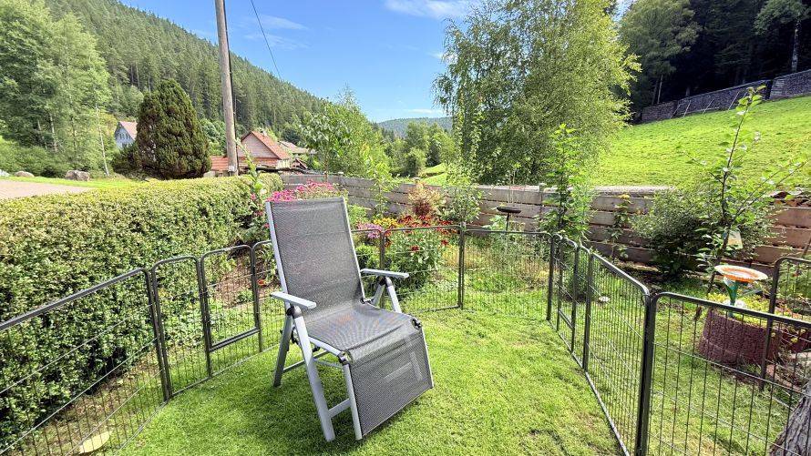Die sonnige naturbelassene ruhig gelegene in drei ein Meter hoch umzäunte idyllische Gartenbereiche mit kleinem Spielplatz mit Blick in den Schwarzwald lädt zum relaxen und entspannen ein.